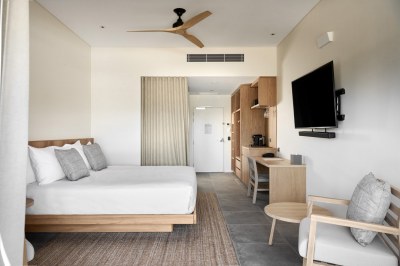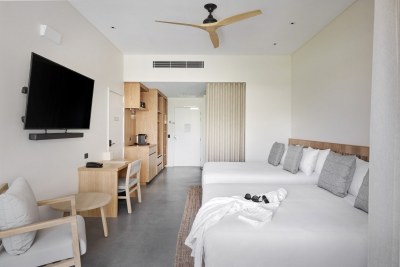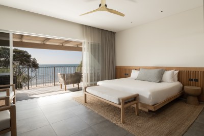 Enjoying views over the pools, they embrace the coastal vernacular with the materials and relaxed colour palette inspired by the rugged coastlines and native flora of the island, adopting different tones throughout the day. Pale wood panelled walls and Jute Rugs giving way to spacious bathrooms with stone finishes and Hunter bathroom amenities. Breezy linen curtains that let you flood the room with diffused light or choose warm lighting and privacy in the evening.